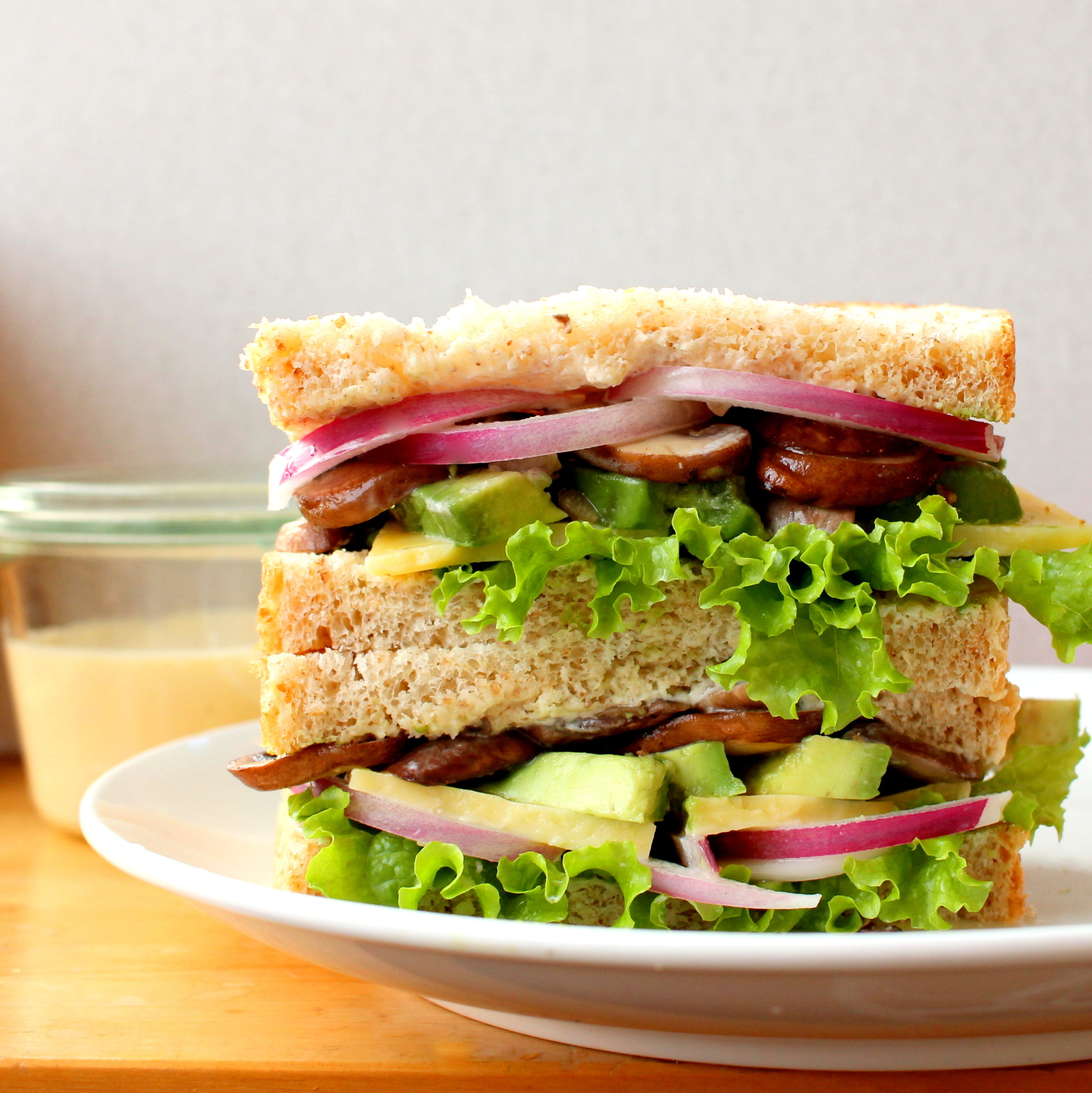 サンドイッチの具は旬のマッシュルームのガーリック炒め、アボガド、紫玉ねぎのピクルス、チェダーチーズとレタスです。